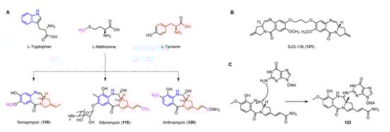 Antitumor antibiotics pyrrolobenzodiazepines (PDBs), including anthramycin, sibiromycin, and tomaymycin, all contain three parts: anthranilate, diazepine, and hydropyrrole (Figure 15A) [92,93]. The imine in the diazepine can be attacked by N-2 of guanine to form a stable covalent bond resulting in inhibiting DNA synthesis (Figure 15C) [94]. Moreover, the crystal structure of the anthramycin-DNA complex indicates that the S-configuration of C-11a make it suitable for docking in the minor groove of DNA [95,96]. In addition, a PDB dimer, SJG-136 (121), which has completed the phase II clinical trial for treating leukemia and ovarian cancer, can form DNA inter-strand and intra-strand cross-linking of DNA (Figure 15B) [97,98].