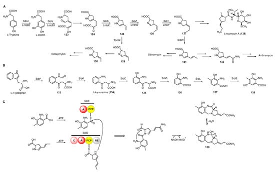 Based on previous feeding experiments, L-methionine, L-tyrosine, and L-tryptophan were supposed to be the biosynthetic precursors of pyrrolobenzodiazepines (Figure 15A) [99]. Like lincomycin biosynthesis, L-dopa from L-tyrosine is cleaved to yield semialdehyde intermediate 123, followed by intramolecular cyclization to form dihydropyrrole intermediate 124 (Figure 16A) [100]. The decarboxylation of intermediate 124 generates 125, which is further converted into a variety of dihydropyrrole precursors (130-132) to be introduced into PDB biosynthesis [101,102,103]. For the biosynthesis of hydroxyanthranilic acid intermediates, L-tryptophan was firstly degraded to L-kynurenine (134), the biosynthetic precursor of important NPs including actinomycin, quinolobactin, and daptomycin [104,105,106]. Following this, 134 goes through three continuous tailoring steps mediated by monooxygenase, kynurenine hydrolase, and methyltransferase, respectively, to generate 3-hydroxyl-4-methyl-anthranilic acid (137), which is subsequently introduced into the anthramycin or oxidized to be the precursor (138) of sibiromycin (Figure 16B) [107]. Two NRPSs containing two (A-PCP) and four domains (C-A-PCP-RE), respectively, are responsible for the formation of the amide bond between two building blocks, and the release and intermolecular cyclization of the chain to afford 139, which is dehydrated to form the final compounds with imine moieties (Figure 16C) [108].