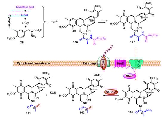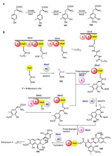 Isotope-labeled precursor feeding experiments have revealed that the skeleton structure of SFMs is derived from tyrosine, alanine, glycine, and methionine (Figure 18) [115,116]. L-tyrosine undergoes C-methylation, oxidation, and O-methylation to afford the precursor 3-hydroxy-5-methyl-O-methyltyrosine (152) (Figure 19A) [117,118]. In 2010, Oikawa and co-workers reconstituted the formation of the core structure in vitro, revealing that two Pictet–Spengler (PS) reactions were involved in this process. Specifically, 152 was firstly activated and uploaded onto PCP of NRPS SfmC, assembling with intermediate 153 produced by NRPSs SfmA and SfmB via the first PS reaction. Following this, 154 formed by the subsequent reduction underwent a second PS reaction and reduction to generate 155 (Figure 19B) [119,120]. The following reduction and intramolecular cyclization of 155 yielded 156 which was then oxidized and methylated to generate 157. Subsequently, 157 was transported outside the cell in company with its fatty acid chain and was removed by the membrane-anchored protein SfmE to produce 158. Finally, SfmCy2 catalyzed the extracellular deamination of 158 to form 142, indicating a prodrug maturation process (Figure 20) [121].