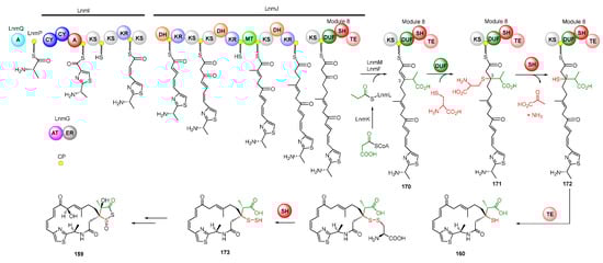 The skeleton of LNM was biosynthesized by hybrid NRPS-PKS assembly lines [127]. The LnmQ, LnmP, and NRPS module of LnmI are responsible for the unique thiazole-containing starter unit. The polyketide chain of LNM is elongated by two AT-less type I PKSs, LnmI and LnmJ, as well as a trans-AT enzyme LnmG [128,129,130,131,132]. A β-branched C3 unit derived from methylmalonyl-CoA was then installed by a set of proteins including a free-standing ACP (LnmL), a bifunctional AT-decarboxylase (LnmK), an HMGS homolog (LnmM), and an ECH homolog (LnmF) (Figure 22) [133,134]. Module 8 in LnmJ, containing a domain of unknown function domain (DUF), added an L-cysteine into C-3 of intermediate 170 to produce intermediate 171. The PLP-dependent cysteine lyase domain (SH) can catalyze the cleavage of the C-S bond to yield 172, which is cyclized to release the chain to generate LNM E1 (Figure 22) [135]. Recently, Meng et al. demonstrated that LnmJ-SH domain directly installed a -SSH group into the LNM polyketide scaffold via cleavage of the C-S bond linking the thiocysteine to form LNM E (173), which might be further transferred to LNM by a set of uncharacterized enzymes [136,137].