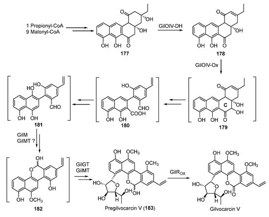 During the biosynthesis of 174, the type II PKS and cyclases afford the angucycline precursor 177 starting from the starter unit propionyl-CoA [141,142]. Subsequent dehydration of 177 generates 178, whose C-ring is oxidatively rearranged to yield 182 through possible intermediates 180 and 181. Following this, 182 is glycosylated to form pregilvocarcin V, which is finally oxidized to gilvocarcin V (Figure 24) [143,144,145,146].