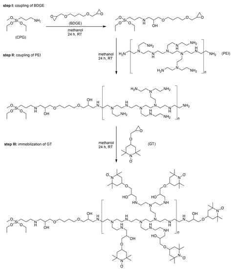 - McCarney, E.R.; Han, S. Spin-labeled gel for the production of radical-free dynamic nuclear polarization enhanced molecules for NMR spectroscopy and imaging. J. Magn. Reson. 2008, 190, 307–315. [Google Scholar] [CrossRef] [PubMed]