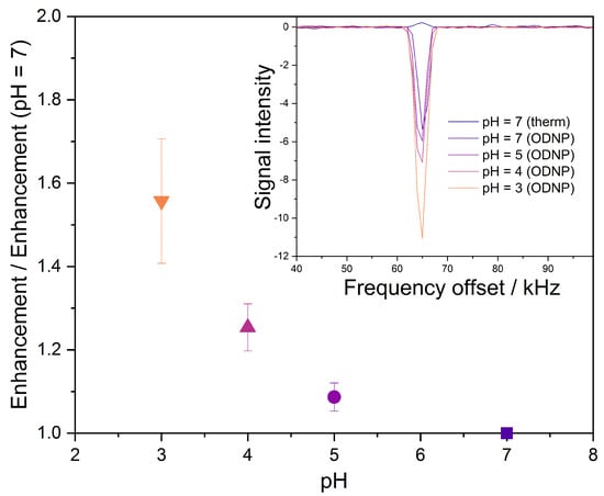 - Gafurov, M.; Denysenkov, V.; Prandolini, M.J.; Prisner, T.F. Temperature Dependence of the Proton Overhauser DNP Enhancements on Aqueous Solutions of Fremy’s Salt Measured in a Magnetic Field of 9.2 T. Appl. Magn. Reson. 2012, 43, 119–128. [Google Scholar] [CrossRef]