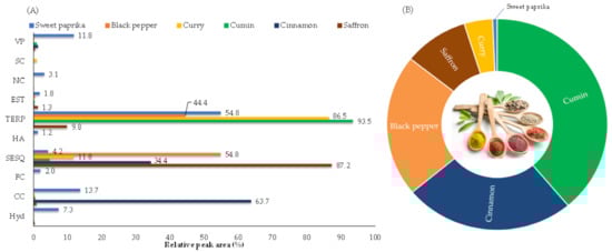 (A): Distribution of the identified chemical classes according to spice; and (B): Distribution of the total volatile fraction for each investigated spice. VP: Volatile phenols; SC: Sulfur compounds; NC: Nitrogen compounds; EST: Esters; TERP: Terpenoids; A: Alcohols; SESQ: Sesquiterpenoids; FC: Furanic compounds; CC: Carbonyl compounds; Hyd: Hydrocarbons.