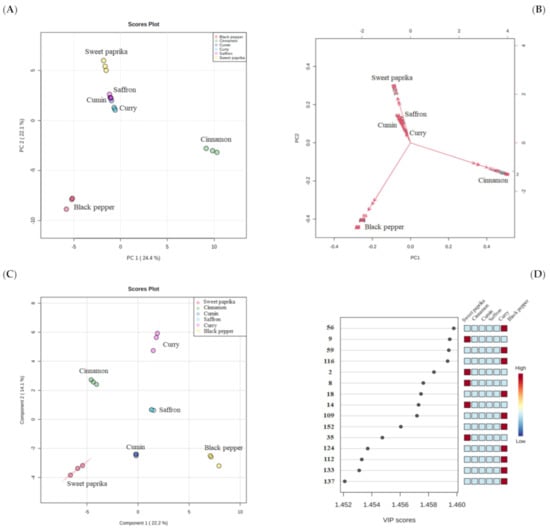 To evaluate the ability of HS-SPME/GC–qMS data to characterize spices in terms of their volatilomic fingerprint, a statistical analysis of the chromatographic data matrix was performed using the MetaboAnalyst 5.0 web-based tool []. The PCA and PLS-DA were applied as multivariate analyses (Section 2.5). The PCA is an unsupervised method that was performed to visualize the difference/similarity among sample profiles and detect significant variables (i.e., VOMs) that contribute to these discrepancies. Figure 3A,B shows the PCA score plot and biplot from the analyzed spices. The variances of the first and second principal components (PC1 and PC2) were 24.4 and 22.1%, respectively, representing 46.5% of the total VOMs variability of data, allowing a good differentiation of the spices, except for saffron and cumin.