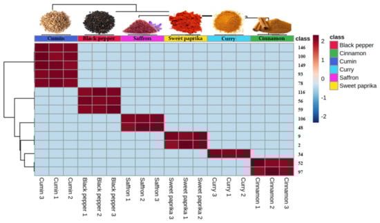 The obtained pvalues by one-way ANOVA with Fisher post-hoc test (p < 0.001) indicated that 94 of 162 VOMs identified were significantly different among the investigated spices. Moreover, HCA was also performed using the 15 most significant VOMs identified in the spice samples obtained by ANOVA. The resulting dendrogram associated with the heat map was performed by Euclidean distance through Ward’s clustering method (Figure 4), providing intuitive visualization of the data set, which along with the statistical analyses carried out previously, allows better identification of the inherent clustering patterns between each spice. Furthermore, these chemometric analyses are an excellent tool for authentication and quality control of the investigated spices.