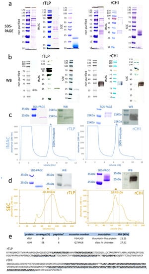 Analysis of recombinant TLP (rTLP) and CHI (rCHI). (a) Electrophoresis gels (SDS-PAGE) show the separation of the non-purified protein fractions and the protein fractions purified by IMAC and SEC. (b) WB membranes showing the detected his-tagged rTLP and rCHI in the non-purified fractions and the protein fractions purified by IMAC and SEC. (c) IMAC chromatograms of the fermentation extracts (selected clones) of rTLP and rCHI. (d) SEC chromatogram of the eluted peak (100% imidazole) of rTLP and rCHI (in Figure 1c). (e) Protein identification based on MS analysis of tryptic peptides and their identification (underlined in blue) in the amino acid sequences of rTLP and rCHI. * Means unique peptides.