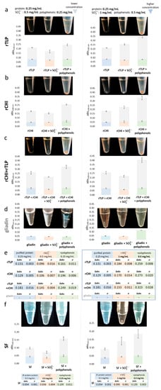 Figure 3 correlates the aggregation potential of rTLP and rCHI to the haze levels (at 540 nm) of the respective solutions (and the residual pellet formed) after a heat test. Both rTLP and rCHI (at 0.25 mg/mL) formed hazy solutions and residual protein pellets after a heat test (Figure 3a,b), even in the absence of haze inducers. This effect was enhanced if both proteins were used (Figure 3c), although the same solutions containing pure gliadins (negative control) did not form haze (Figure 3d). The SF colloids (Figure 3e) formed haze similarly to rTLP and rCHI, with protein aggregation highly induced by sulfite ions (at 1 mg/mL) and polyphenol extracts (at concentrations of 0.25 mg/mL and 0.5 mg/mL).