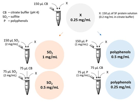 rTLP and rCHI were incubated at 25 °C for 1 h with different concentrations (Figure 4 and Figure S3) of sodium sulfite (Na2SO3, Carl Roth KG), to obtain its dissociated form , and polyphenol extracts (both dissolved in 0.1 M citrate buffer pH 4). Aggregation experiments combined 0.25 mg/mL of protein (rTLP, rCHI and gliadin as control) solutions at two different concentrations (1 mg/mL and 0.5 mg/mL, based on Pocock et al. [19]) of sodium sulfite and two concentrations (0.5 and 0.25 mg/mL, based on Gazzola et al. [1]) of polyphenol extracts (Figure 4). Subsequently, haze tests were performed as described in Section 4.8.1 and the absorbance was measured pre (haze) and post (supernatant) centrifugation (12,000× g for 10 min) and compared with the visual residual pellets formed. Controls were performed with gliadin (a protein with less haze potential) and solutions without proteins (only polyphenols or sulfite) were used as blanks. The same experiments were performed with lyophilized samples of a SF wine (see Section 2.8 of Supplementary Materials) to compare the haze potential of recombinant proteins with that of native wine proteins (from V. vinifera) under the same experimental conditions. All experiments were performed in triplicate.