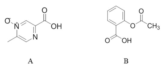 Chemical structures of the analytes: acipimox (A) and the internal standard (IS) acetylsalicylic acid (B).