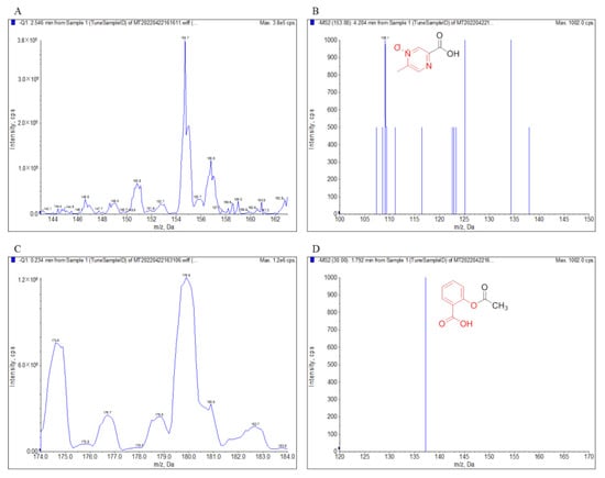 The MS Scan spectra, product ion spectra of [M−H]− and their fragmentation pathways. The MS Scan spectra of acipimox (A), product ion spectra of [M−H]− of acipimox (B), MS Scan spectra of IS (C), and product ion spectra of [M−H]− of IS (D).