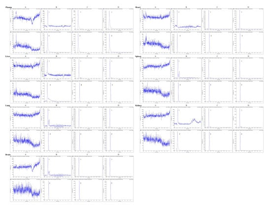 Typical multireaction monitoring chromatograms of acipimox and internal standard. (A) a blank plasma or tissue homogenate; (B) a blank plasma or tissue homogenate spiked with acipimox at LLOQ level (the concentrations shown in Table 2) and IS of 5 μg/mL; (C) a blank plasma or tissue homogenate spiked with acipimox (plasma: 25 μg/mL; heart, liver: 1 μg/mL; spleen, kidney, brain: 5 μg/mL; lung: 10 μg/mL) and IS (5 μg/mL); (D) a plasma or tissue homogenate sample collected 0.5 h after drug administration. 1: acipimox; 2: IS.