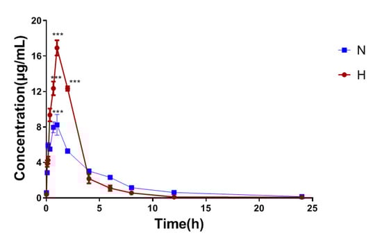 Mean plasma concentration-time curves of acipimox in rats with and without hypoxia following intragastric administration to rats (n = 6). N: Normoxia; H: Hypoxia; *** p < 0.001.