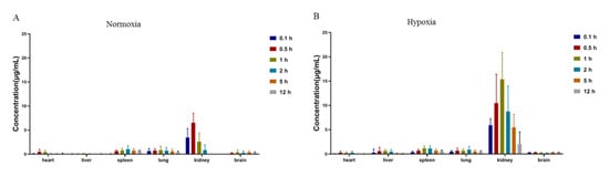 Tissue distribution of acipimox in rats with and without hypoxia after oral administration to rats (n = 6). (A) Tissue distribution of acipimox in normoxic rats; (B) Tissue distribution of acipimox in hypoxic rats.