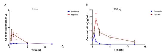 The concentration of acipimox in kidney and liver with and without hypoxia after oral administration to rats (n = 6). (A) Mean concentration-time curves of acipimox in liver; (B) Mean concentration-time curves of acipimox in kidney. * p < 0.05.