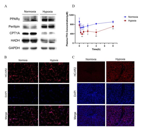 To investigate the effect of hypoxia on the metabolism of acipimox, the protein levels of key markers regulating lipid metabolism in liver were investigated. As shown in Figure 7A, compared to the normoxic group, the expressions of CPT1A and HADH in liver were down-regulation in hypoxic rats, while the expressions of PPARγ and perilipin were up-regulated. This indicates that the consumption of FFA by liver was reduced under the hypoxic environment and more FFA was stored in lipid droplets, which could lead to the accumulation of lipid droplets and decrease FFA in serum. Next, we used immunofluorescence staining to determine whether hypoxia increased the target protein expression of acipimox in liver and adipose tissue. HCAR2 expression in the normoxia group was lower than that in the hypoxia group (Figure 7B,C). Among them, the up-regulation was especially obvious in liver tissue. According to the metabolic characteristic of acipimox, we speculate that the metabolism changes of acipimox might be related to the expression changes of HCAR2 and the lipid metabolism-related proteins, the changes of blood flow to organs, and changes in gut microbiota. We will verify the hypothesis in future work.