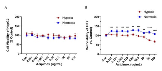 The cytotoxicity of acipimox on kidney and liver in normoxia and hypoxia condition. The effect of acipimox on proliferation in HepG2 (A) and HK-2 cells (B). ** p < 0.01, *** p < 0.001 and **** p < 0.0001.