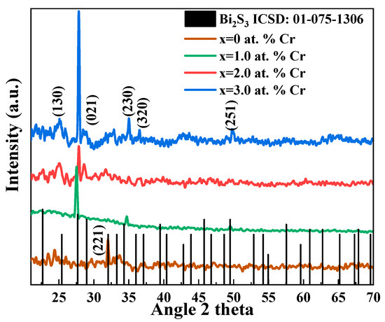 The XRD patterns are shown in Figure 2. The polycrystalline structure of the deposited thin films is evident by sharp and well-defined peaks. XRD analysis shows that both undoped and doped materials (Bi2S3 and Bi2−xCrxS3) fit the bismuthinite phase of bismuth sulphide, with an orthorhombic structure (ICSD No: 01-075-1306), as shown by black vertical lines in Figure 2. The lack of additional peaks matching Cr or Cr-related, as well as Bi-related, peaks, suggests the formation of a single phase of Bi2S3 with high Cr homogeneity. For doped samples, a preferred orientation along the 021 plane is observed. Upon doping, the thin film growth process is influenced, resulting in the shifting of preferred planes [40].