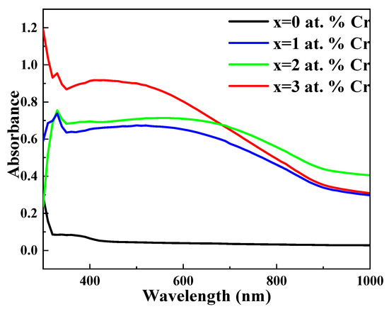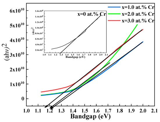 The absorbance-versus-wavelength plot of chromium-doped bismuth sulphide thin film systems is shown in Figure 4. The strong absorbance region in this figure is between 400 and 800 nm, while in the infrared region, there is noteworthy absorbance. Furthermore, the absorption in the near-infrared region harvests more photons to invert into photocurrent [46]. The position of the absorption edge shifts red as the Cr content increases from 0 to 3 at. Percent. By modifying the ratio of Bi and S atoms, the addition of Cr to the system changes the average atomization energy, leading to this shift. The red shift in the absorption spectra will be helpful to enhance the ability of the synthesized materials to absorb a wider spectrum of light (more in the visible region). Additionally, Table 2 shows the compositions’ optical absorption coefficients, which ranged from 105 to 106 cm−1, and confirms their potential as effective absorber materials for solar applications.
