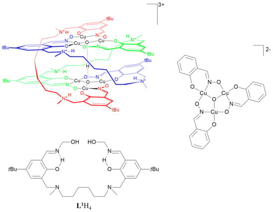 There are few reports of copper(II) complexes of doubly deprotonated phenolic oximes. One describes a hexanuclear species [{Cu3O}2H(L1H2)3]3+ obtained from the proligand L1H4 which has two salicylaldoxime molecules linked by a [-CH2N(CH3)C5H10N(CH3)CH2-] unit [21]. In forming the complex, two protons are transferred to the amine N atoms in each ligand. The two trinuclear {Cu3-μ3-O}4+ units are held together by the three [-CH2NH(CH3)C5H10NH(CH3)CH2-]2+ straps and by a proton between the μ3-oxygen atoms as shown in Figure 2.
