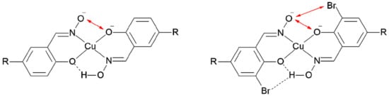 The dominance of the peaks corresponding to anionic trinuclear complex [Cu3O(L5)3]− in the ESI-MS is at first sight surprising, given that mononuclear 1:2 complexes, ([Cu(LH)2] see Figure 1) are the only species observed when the phenolic oximes are used in solvent extraction of copper [4,5]. The stability of these uncharged [Cu(LH)2] complexes is enhanced by their pseudo-macrocyclic structures involving the interligand H-bonding shown in Figure 1. However, if deprotonation of an oximic OH group occurs to generate the monoanionic species ([Cu(L)(LH)]−, the pseudo-macrocyclic structure is lost (see Figure 8) and the anion is destabilized by repulsion between the oximate and phenolate oxygen atoms [44].