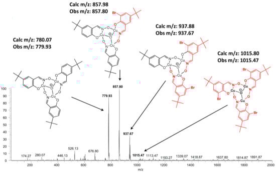 An MeCN solution containing a 2:1:1 molar ratio of copper(II) acetate and L6H2 and its 3-bromosubstituted derivative L8H2 gave an ESI-MS spectrum containing four trinuclear complexes: [Cu3O(L6)3]−, [Cu3O(L6)2(L8)]−, [Cu3O(L6)(L8)2]−, and [Cu3O(L8)3]− (Figure 9). The relative intensities of these (0.9:1:0.4:0.02) in comparison to a homogenous statistical distribution (1:3:3:1) will depend on to what extent the presence of the bromine atom influences their relative stabilities and their intensities will also depend on their stabilities relative to the mononuclear complexes [Cu(L6)(L6H)]−, [Cu(L6)(L8H)]−, [Cu(L6H )(L8)]−, and [Cu(L8)(L8)]− (the weak peaks clustered at m/z values at 447, 526, 526, and 605, respectively) which are formed on ionization of the neutral complexes [Cu(LH)2]. The stabilities of the monoanions are influenced by H-bonding and electrostatic repulsion as shown in Figure 8. The presence of the 3-bromo substituent buttresses the interligand H-bonding when the oxime OH group is present [45] but enhances repulsion between the ligands when the oxime proton is lost.t [45].