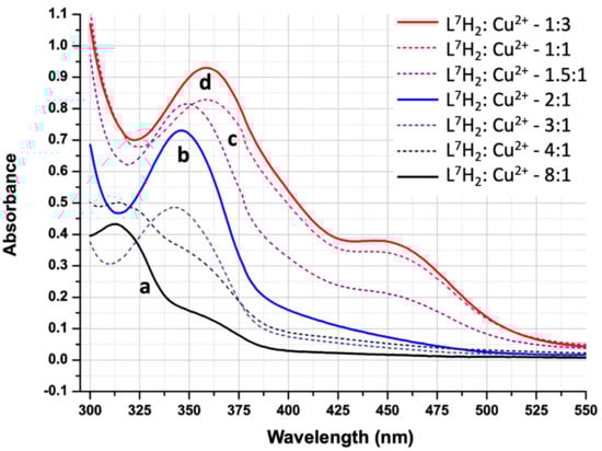 The proligand has an absorption maximum at 313 nm and a shoulder around 360 nm. When in excess, the tail of the proligand’s π-π* UV bands (Figure 10a) dominates the spectrum. Increasing the L7H2to Cu2+ molar ratio to 2:1 results in the π-π* maximum (Figure 10b) shifting to 346 nm, which can be assumed to arise from the increased conjugation found in the [Cu(L7H)2] complex. When the concentration of copper is equimolar to that of L7H2 (Figure 10c) the π-π* maximum shifts to 359 nm and a second maximum at 446 nm is also observed. These bands do not shift position as the copper concentration is increased further (Figure 10d). The results are consistent with the speciation indicated by the ESI-MS results (above): only the 1:2 complexes [Cu(LH)2] or 1:1 trinuclear complexes containing either [Cu3O(L)3]− or [Cu3OH(L)3] are present in significant concentrations in solution.