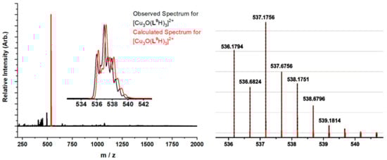 Evaporation of an acetonitrile solution yielded a green solid which was soluble in water. Addition of KClO4 gave a dark green precipitate with both low and high resolution mass spectra (Figure 11) suggesting that it contained the complex [Cu3O(L9H)3(ClO4)]+ in an assembly with a ClO4− ion.