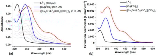 (a) The UV/Vis absorption spectra for varying concentrations of L9H2, [Cu(L9H)2] and {[Cu3OH(L9)3(ClO4)](ClO4)}2 and (b) their respective molar extinction coefficients, obtained by the absorbance vs. concentration plots form (a).