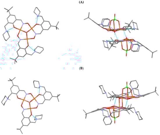 The four donor atoms in the inner coordination spheres of the Cu(II) atoms are nearly planar (see Figure 13), as found in mononuclear Cu(II) complexes of phenolic oximes [46] and bond lengths fall in similar ranges. In both A and B the weak bonding commonly found [46] in axial sites of mononuclear Cu(II) complexes involves interactions with perchlorate counter anions.