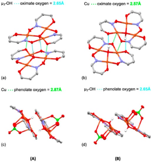 The most significant difference between the crystalline forms is the way in which the trinuclear components assemble to generate the hexanuclear complex. Unlike most other hexanuclear Cu complexes, (see for example Figure 2), the two triangular units are not brought together by formation of a μ3-O…H…μ3-O bridge. In the crystalline form A, the two trinuclear units are held together by each μ3-OH group forming a hydrogen bond to an oximate O-atom (μ3-OH…O, 2.65 Å) in the adjacent unit and by two Cu-atoms forming weak bonds to a phenolate O-atom, as seen in Figure 14. In form B the intermolecular bonding involves each μ3-OH group forming a hydrogen bond to a phenolate O-atom (μ3-OH…O, 2.84 Å) in the adjacent unit and by two Cu-atoms forming weak bonds (2.573(2) Å) to an oximate O-atom. The very weak intermolecular Cu…phenolate bonds have lengths (2.871(3) and 2.573(2) Å in A and B) typical of those found in copper complexes formed by phenolic oximes [46].