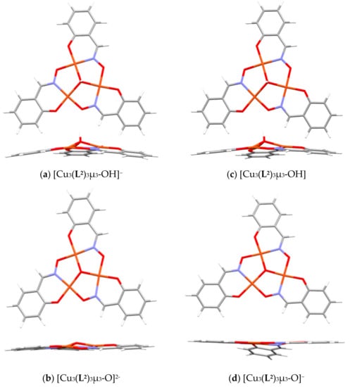The energy-minimized structures for (a) [Cu3(L2)3μ3-OH]−, (b) [Cu3(L2)3μ3-OH], (c) [Cu3(L2)3μ3-O]2− and (d) [Cu3(L2)3μ3-O]−.