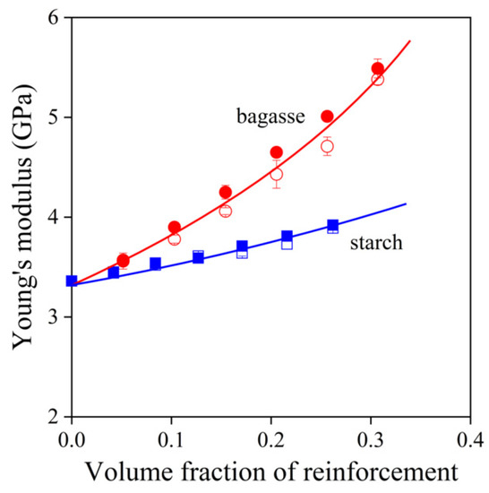 Since fiber-reinforced materials are mostly used in structural applications, the attention is focused mainly on their mechanical properties. The stiffness of the composites containing various amounts of the two reinforcements is shown in Figure 2. Both reinforcements increase stiffness, but to considerably different extents, bagasse fibers have a much stronger reinforcing effect than starch. The stiffness of natural fibers was shown to cover a wide range from several 10 to several 100 GPa [50,55]; the direct measurement of the stiffness of the fibers used in this study resulted in the value of 25 GPa [51] that is in line with their reinforcing effect. Unfortunately, the direct determination of the stiffness of starch particles is very difficult, if not impossible, and we found only a single paper reporting the modulus value for starch, which was derived indirectly from the study of epoxy resin/starch and polycaprolactone/starch blends [56]. The value given was 2.7 GPa that cannot be correct since the addition of starch clearly increases the stiffness of neat PLA having a modulus of 3.3 GPa.