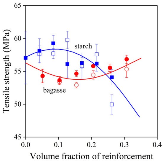 The strength of interfacial adhesion is difficult to predict from the model because of the different size and shape of the particles, but it can be estimated by the reversible work of adhesion. This latter can be calculated from the surface tension of the components. The matrix of the composites was the same, and the surface tension of the two reinforcements is quite similar, 35 mJ/m2 was measured for starch, while 38 mJ/m2 for bagasse fibers by inverse gas chromatography leading to similar work of adhesions (99.4 mJ/m2 and 100.2 mJ/m2 respectively), i.e., strength of interfacial adhesion.