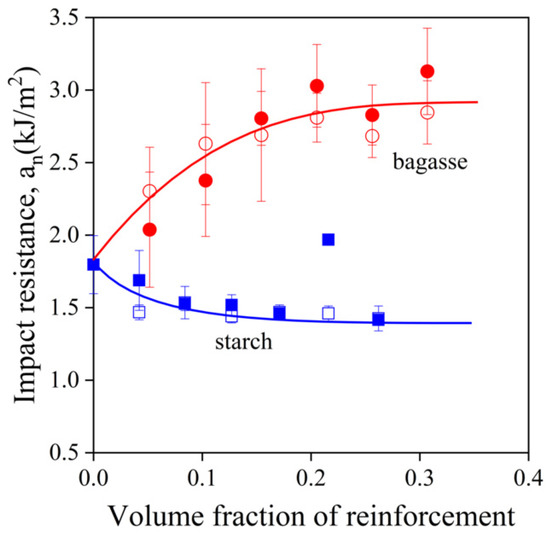 Impact resistance is another mechanical property that is important for most structural materials; generally large strength and impact resistance is required from such materials used in practice [59,60]. The impact strength of the composites prepared in this study is presented in Figure 4. The effect of the two reinforcements differs considerably from each other. The addition of bagasse fibers doubles the impact strength of PLA, while the addition of starch decreases it slightly. The opposite effects must be caused by the different failure mechanism of the composites containing the two kinds of additives. The effect of coupling is very slight again. This small effect must be related to the interaction of the components and to the local deformation processes taking place during failure. The main factors determining composite properties are particle characteristics and to some extent interfacial adhesion.
