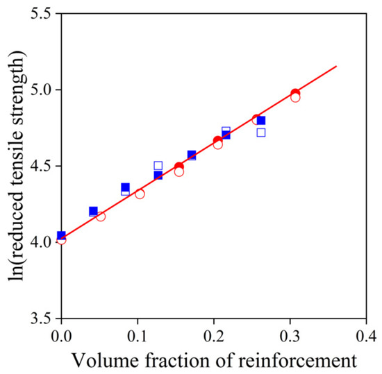 where σT shows the true tensile strength of the composite; σT0 is the same for the matrix, φf shows the volume fraction of the second component, and B is the load-bearing capacity of the reinforcement. The latter depends on interfacial adhesion. True tensile strength (σT = σλ, where λ = L/L0, is the relative elongation) expresses the change in the cross-section of the specimen during deformation and λn takes into account strain hardening (n can be determined from matrix properties and characterizes the strain hardening tendency. Reduced tensile strength can be expressed by the rearrangement of Equation (1)