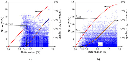 The comparison of the two plots presented in Figure 6a,b reveals a number of similarities, but also differences. The amplitude, i.e., strength, of the signals indicated by the height of the points on the vertical axis is approximately the same, although signals with higher energy seem to be located in larger numbers at the first part of the measurement in the starch composite (Figure 6a). Both plots show that signals start to appear after a certain, critical deformation, which is larger for the starch composite than for the one containing bagasse. If debonding is the main local deformation process, this difference can be clearly explained by the smaller size of the starch particles, since debonding stress is inversely proportional to particle size [64]. The signals in Figure 6a seem to form only one group but their high amplitude and the shape of the cumulative number of signals trace indicate the occurrence of a second process besides debonding which may be the fracture of starch particles, although one would not expect this to happen and it needs further proof.