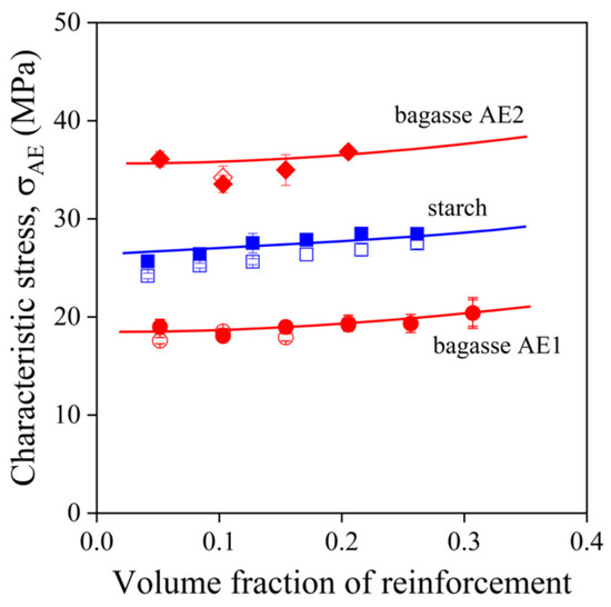 The plotting of the cumulative number of signal traces allows the determination of characteristic stresses which can be assigned to the local processes taking place during the deformation of the specimen. The determination of these values from the plots is shown in Figure 6. Characteristic stresses determined for the processes detected, σAE1 and σAE2, are plotted against composition in Figure 7. Only one characteristic stress could be determined for the starch composites with any reliability. The first process in bagasse fiber composites is initiated at smaller stress and is unambiguously assigned to debonding. The larger stress obtained for starch is consistent with the explanation given above, i.e., debonding needs larger stress for smaller particles. In the case of the fiber-reinforced polymer the second process is mostly related to the fracture of the fibers [52,57,59].