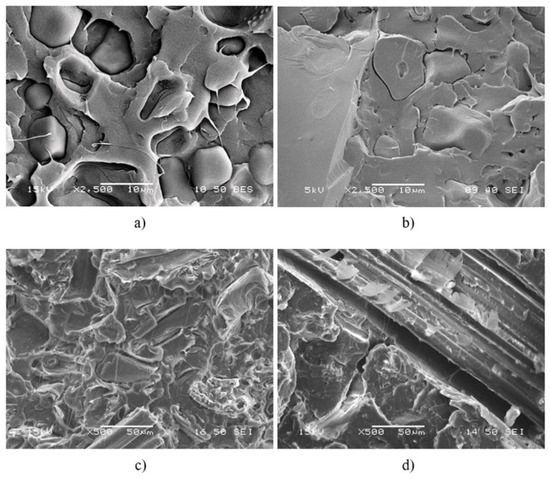 SEM micrographs recorded on the fracture surface of specimens broken during tensile tests are presented in Figure 8 for samples containing starch or bagasse fibers with or without coupling. Considerable debonding can be observed in Figure 8a in the composite containing starch without coupling, while less debonding and the fracture of some particles are observed in Figure 8b in the presence of the coupling agent (MAPLA). One could draw the conclusion from these results that coupling is very efficient that would contradict all earlier conclusions. However, we must call the attention here to the fact that SEM micrographs cover only a very small area of the fractured surface of the specimen. Some micrographs prepared showed less debonding than in Figure 8a and even some broken particles in the absence of the coupling agent, and, on the other hand, larger number of debonded particles in its presence. Nevertheless, the micrographs verify the occurrence of two processes in these composites and identify them as debonding and particle fracture. Very similar micrographs were also recorded on composites containing the bagasse fibers, as shown by Figure 8c,d; the two processes, debonding and fiber fracture, can be clearly identified also in these micrographs.