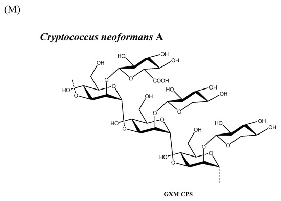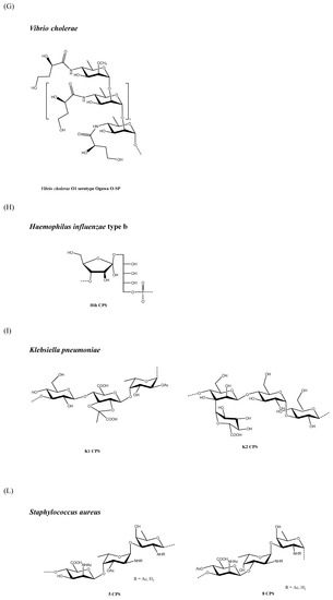 Chemical structure of the PS RU discussed in this review. (A) Group B Streptococcus, (B) Streptococcus pneumoniae, (C) Neisseria meningitidis, (D) Salmonella, (E) Francisella tularensis, (F) Shigella, (G) Vibrio cholerae, (H) Haemophilus influenzae type b, (I) Klebsiella pneumoniae, (L) Staphylococcus aureus, (M) Cryptococcus neoformans A.