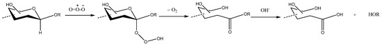 Proposed reaction mechanism of •OH on a PS chain. The diagram shows the predicted reaction that occurs after •OH subtracts a hydrogen atom from the C–H of carbons involved in the glycosidic bond, thus resulting in fragmentation of the PS [75].