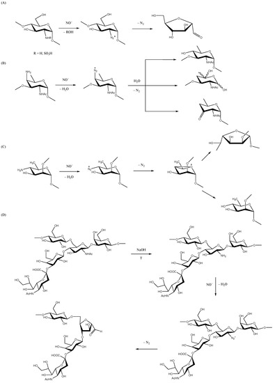 Nitric oxide (NO) and nitrous acid (HNO2) share a common intermediate, the nitrosonium cation (NO+), which is capable of nitrosating free amino or N-sulfo groups (but not N-acetyl groups). The nitrosation reaction requires an acidic environment (pH = 4 or pH = 1.5 for amino or N-sulfo groups, respectively). In the case of 2-amino-2-deoxy sugars, the reaction produces a loss of nitrogen with a ring contraction to generate 2,5-anhydro sugars coupled with the elimination of the aglycone (Scheme 4A). Moreover, 4-amino-4-deoxy sugars are also susceptible to deamination as a result of a similar mechanism [80,81]. Not all deamination reactions lead to breaking glycosidic bonds, as this depends on the favored conformation of the 4-amino group and the glycosidic linkage. As such, the deamination of 4-amino groups of 3-linked 2-acetamido-4-amino-2,4,6-trideoxygalactopyranosyl (AATp) residues will break both C-3 and C-1 of AATp (Scheme 4B; [80]), thus resulting in PS fragmentation, whereas deamination of 4-amino groups of 2-linked 4-amino-4,6-deoxymannopyranosyl residues will not break the glycosidic bond (Scheme 4C) [81].