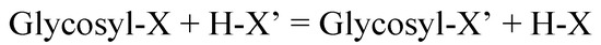 Glycoside-cleaving enzymes are a heterogenous group, which, in a somewhat selective way, hydrolyze the wide variety of O-glycosidic linkages found in glycosides, oligo- and polysaccharides, and glycoconjugates. Enzyme-catalyzed glycoside cleavages (and syntheses) are considered variants of the same reaction (Scheme 6). They are catalyzed by a single type of enzyme, a glycosylase, a group which includes glycoside hydrolases, glycosyl transferases, phosphorylases, and some lyases [92]. This equation describes carbohydrase reactions as an exchange between a glycosyl group and a proton at the X and X’ sites in the substrates.