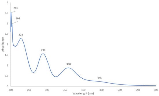 The complex [Cu(12-crown-4)2]I5 shows absorptions in the wavelength range between 200 to 500 nm (Figure 1). The spectrum is dominated by peaks of smart triiodides at 290 and 360 nm in agreement with our previous investigations (Table 1) [34,52].