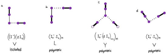 Shestimerova et al. concluded an L-shaped structure for their polymeric pentaiodide [(3-HOC5H9NH2)I5] (Table 3) [47]. The asymmetric triiodide unit (I1-I3-I5) is bonded by weak halogen bonds through its I1 atom to an iodine molecule (I2-I4) (Table 3, Figure 3b).