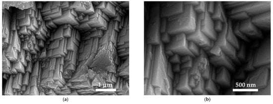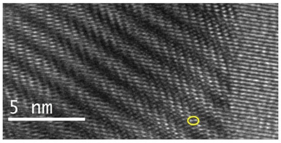 Figure 6a reveals a highly single-crystalline morphology and includes some stacking faults. These patterns can be clearly seen in Figure 6b. The main layer is a wave-like structure with parallel lattice fringes along {001}. The average d-spacing is 0.274 nm (2.74 Å). Figure 6b depicts another wave- or barrel-like enhanced area, which seems to be further layers on the main crystal lattice or stacking faults. The barrel-like structure is arranged at an angle of around 115° to the main lattice fringe.