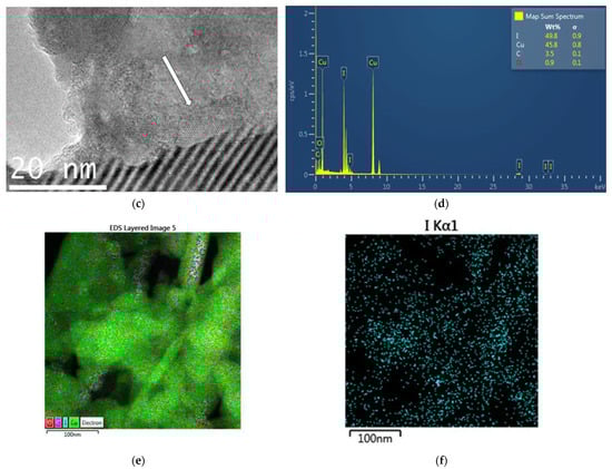 Transmission electron microscopy (TEM) of [Cu(12-crown-4)2]I5: (a) 20 nm; (b) 5 nm with average d-spacing of lattice fringes; (c) direction of the main lattice fringes in comparison to the black-white colored barrel-like structures; (d) Energy dispersive spectroscopy (EDS); layered images: (e) all atoms; and (f) I-atom.