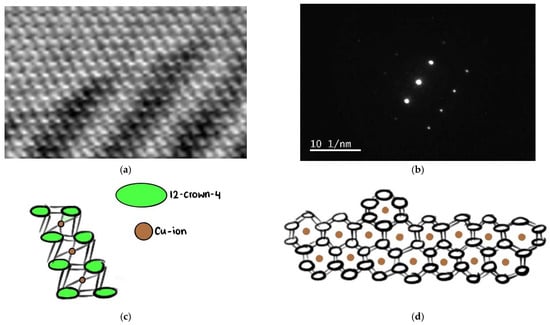 The transmission electron microscopy (TEM) of [Cu(12-crown-4)2]I5: (a) 1274% magnification of Figure 6c; (b) electron diffraction pattern along lattice fringe; and illustration of structures (c) ribbon; (d) honeycomb.