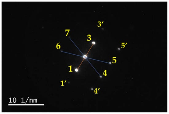 The bright spots 1, 2, and 3 are arranged within an average angle of 179.97°, with weaker points above (6, 7) and below (4, 5) along the lattice fringe (Figure 9). The weaker spots 6-7 and 4-5 are parallel lines to 1-2-3. The upper, weakly-appearing parallel line (6-7) is away from the central line 1-2-3 around an average of 6.95 1/nm along the lattice fringe (Figure 9). The lower-right arranged line (4-5) is on average 7.3 1/nm away from the central arrangement. The distances between 2 and points 4, 5, 6, and 7 are 7.18, 7.31, 6.92, and 7.15 1/nm, respectively (Figure 8). Distances between the points 4′-4, 4-5, 5-5′, and 6-7 are 4.302, 4.692, 4.67, and 4.61 1/nm, respectively (Figure 9). There are also several weak spots, which seem to be either disorders or further structural determinants in the structure. Figure 9 is along the {001} zone axis. The points 1, 6, and 7 are related to (−200), (−1−30), and (1−30).
