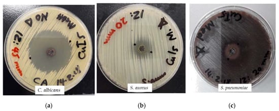 The Agar Well (AW) analysis of the title compound (with concentrations of 11, 5.5, and 2.75 µg/mL). From left to right: (a) C. albicans WDCM 00054; (b) S. aureus ATCC 25932; and (c) S. pneumoniae ATCC 49619.